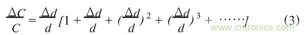 最后要說明的是關于非線性的問題。由下圖我們可以看到變間隙式電容傳感器相對輸出表達式為: