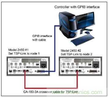 對(duì)于計(jì)算機(jī)與2450型儀器的GPIB通信,只需要1根電纜,實(shí)現(xiàn)GPIB接口與2450型儀器IEEE-488接口的連接(圖8中2450型#1)。將2450型#1的TSP-Link節(jié)點(diǎn)設(shè)為節(jié)點(diǎn)1,將2450型#2的TSP-Link節(jié)點(diǎn)設(shè)為節(jié)點(diǎn)2。