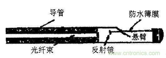 1、壓力測量。目前臨床上應用的壓力傳感器主要用來測量血管內(nèi)的血壓、顱內(nèi)壓、心內(nèi)壓、膀胱和尿道壓力等。用來測量血壓的壓力傳感器示意見圖3。其中對壓力敏感的部分是在探針導管末端側壁上的一塊防水薄膜,一面帶有懸臂的微型反射鏡與薄膜相連,反射鏡對面是一束光纖,用來傳遞入射光到反射鏡,同時也將反射光傳送出來。當薄膜上有壓力作用時。薄膜發(fā)生形變且能帶動懸臂使反射鏡角度發(fā)生改變,從光纖傳來的光束照射到反光鏡上,再反射到光纖的端點。由于反射光的方向隨反射鏡角度的變化而改變,因此光纖接收到的反射光的強度也隨之變化。這一變化通過光纖傳到另一端的光電探測器變成電信號,這樣通過電壓的變化便可知探針處的壓力大小。