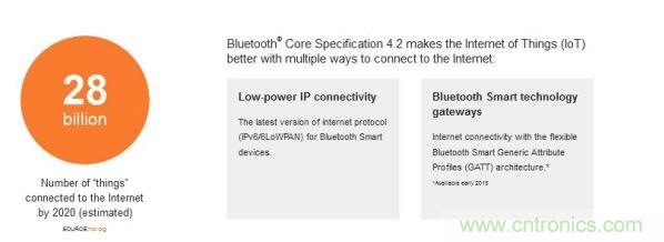 藍(lán)牙4.2版本的主要更新項(xiàng)目包括隱私權(quán)限保護(hù)的改善與速度的提升,一個(gè)支持IP連接的配置文件也即將核準(zhǔn)。藍(lán)牙4.2版本將為開(kāi)發(fā)人員、OEM代工業(yè)者及整個(gè)業(yè)界帶來(lái)新機(jī)會(huì),也為消費(fèi)者帶來(lái)更好的用戶(hù)體驗(yàn),并打造前所未有的使用案例。