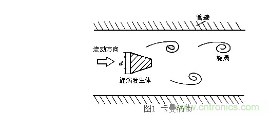 根據(jù)卡曼渦街理論(見(jiàn)圖一),在無(wú)限界流場(chǎng)中垂直插入一根無(wú)限長(zhǎng)的非線性阻力體(即旋渦發(fā)生體C,風(fēng)速傳感器的探頭橫桿),當(dāng)風(fēng)流流經(jīng)旋渦發(fā)生體C時(shí),在漩渦發(fā)生體邊緣下游側(cè)會(huì)產(chǎn)生兩排交替的、內(nèi)旋的旋渦列(即氣流旋渦),而旋渦的產(chǎn)生頻率f正比于流速V,用公式表示如下: