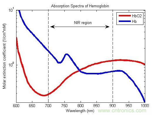 一般來(lái)講,完整的血氧飽和度儀往往有2種發(fā)光二極管,一種波長(zhǎng)660nm,是可見(jiàn)光的紅光,一種波長(zhǎng)900多nm,是紅外線。血管中攜氧的血紅蛋白和不攜帶氧的血紅蛋白,對(duì)兩種光的吸收率是不同的。如下圖。