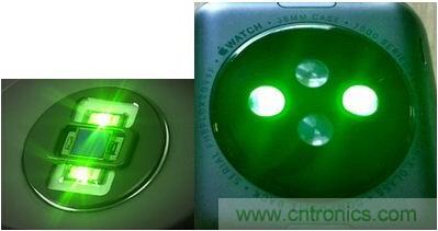 這種方案是追蹤可見(jiàn)光(綠光)在人體組織中的反射。通常是有兩個(gè)綠色LED向手腕發(fā)出可見(jiàn)光,然后中間有個(gè)光電