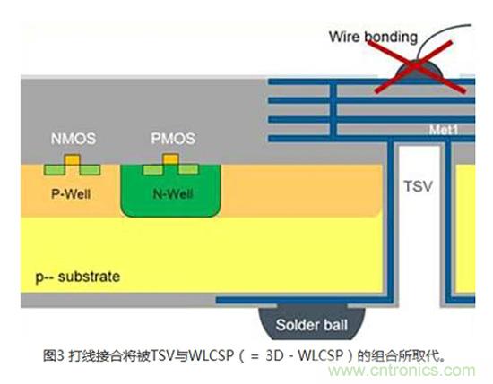 模擬3DIC技術(shù)通常是透過建造芯片正面到IC背面的電氣連接來實(shí)現(xiàn)傳感器應(yīng)用。 在許多傳感器應(yīng)用,例如光學(xué)、化學(xué)、氣體或壓力傳感器中,感測區(qū)域是位在CMOS側(cè)(晶圓的頂端)。 芯片和導(dǎo)線架之間最常用的連接是打線接合(Wire bonding)(圖1)。 無論是使用塑料封裝,或是將裸片直接接合在印刷電路(PCB)或軟性電路板上,對于某些會將感測區(qū)域暴露出來的應(yīng)用而言,打線接合并非理想的解決方案。 采用專業(yè)晶圓代工業(yè)者的專有TSV技術(shù),可以利用TSV、背面RDL和芯片級封裝(WLCSP)(圖2)來替代打線。