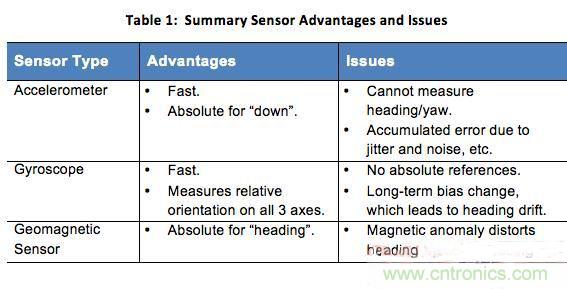 如前所述,加速度計(jì)、陀螺儀和地磁傳感器每個都有各自的優(yōu)缺點(diǎn)。下表1總結(jié)了每種傳感器在運(yùn)動跟蹤方面的主要優(yōu)勢和問題。