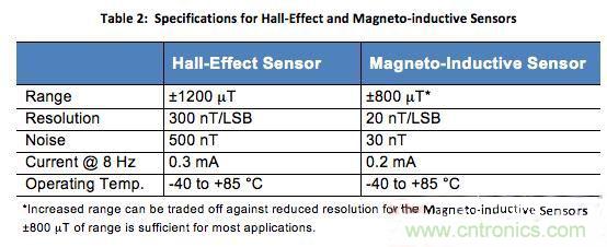 在今天的消費(fèi)電子產(chǎn)品中使用最廣泛的地磁傳感器是霍爾效應(yīng)傳感器。這種傳感器主導(dǎo)消費(fèi)市場的原因是體積小、價格低并且節(jié)省功耗。但這種傳感器同樣有噪聲,很容易受其它磁場干擾,這些問題如果不校正將限制其向陀螺儀提供正確航向數(shù)據(jù)的能力。然而,如果能夠接受稍大尺寸的永磁感應(yīng)式地磁傳感器,就可以在不犧牲成本或功耗的情況下獲得顯著改進(jìn)的噪聲與分辨率性能。表2顯示了霍爾效應(yīng)和永磁感應(yīng)傳感器的規(guī)格。注意,永磁感應(yīng)傳感器可以提供明顯更低的噪聲和更高的分辨率。