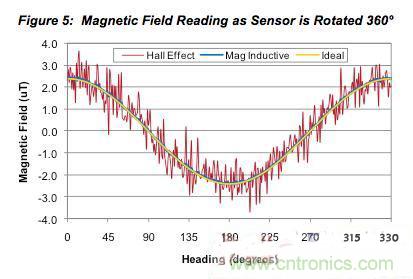 圖5:當(dāng)傳感器旋轉(zhuǎn)360°時的磁場讀數(shù)。