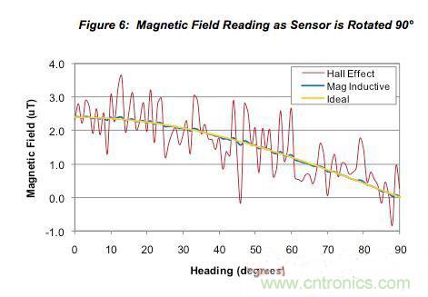 下圖顯示了地磁傳感器在磁場強(qiáng)度為2.4mT數(shù)量級的固定位置旋轉(zhuǎn)時輸出的磁場讀數(shù)。在圖5中,傳感器旋轉(zhuǎn)了整整360°,而在圖6中,傳感器從0°旋轉(zhuǎn)到90°。這兩張圖都繪出了霍爾效應(yīng)傳感器、永磁感應(yīng)傳感器和理想傳感器的試驗(yàn)數(shù)據(jù)。