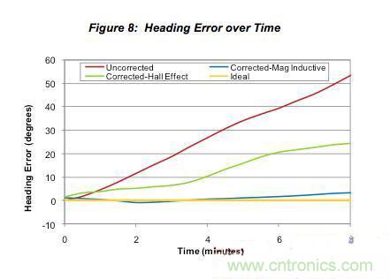 永磁感應(yīng)傳感器可以更好地控制零偏漂移的能力將顯著改善隨時間變化的航向性能,如圖8所示。我們在這里可以看到,與未校正系統(tǒng)相比,使用霍爾效應(yīng)傳感器的傳感器融合系統(tǒng)的長期性能在8分鐘內(nèi)減少航向誤差的效果高出2倍。但使用永磁感應(yīng)傳感器的傳感器融合系統(tǒng)與未校正系統(tǒng)相比可以減少航向誤差一個數(shù)量級,比基于霍爾效應(yīng)磁力傳感器的系統(tǒng)好5倍。