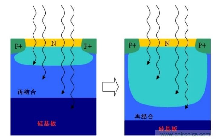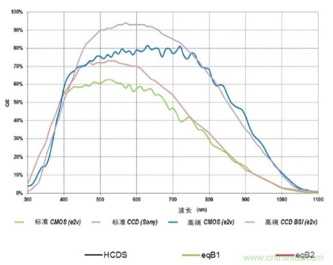 量子效率(Quantum efficiency ,QE) 是直接影響圖像傳感器光電性能的因素,因為光電轉(zhuǎn)換效率的任何損耗都會直接減低信噪比 (Signal-To-Noise- Ratio,SNR) 。它的影響是兩方面的,因為當散粒噪聲(信號的平方根)是主要噪聲源時,QE不單是信噪比的被除數(shù)(信號),同時也是除數(shù)(噪聲)。在這一點之上,CCD和CMOS處于同一水平,可是CCD在QE改進方面累積有多年的技術(shù)工藝優(yōu)化,而在CIS的QE改進發(fā)展相對較遲?;诠栉镔|(zhì)的物理特性,較長的波長能穿透光敏轉(zhuǎn)換地帶,所以會使用厚的外延材料來增加上紅色和近紅外線波長的QE。根據(jù)比爾朗伯定律(Beer-Lambert law),被吸收的能量是與介質(zhì)的厚度成指數(shù)關(guān)係。高端應(yīng)用的 CCD 利用較厚的硅物質(zhì)和背照(back side illumination ,BSI)工藝以恢復(fù)高寬帶QE和近紅外線(near infrared ,NIR)敏感度,因而擁有優(yōu)勢。