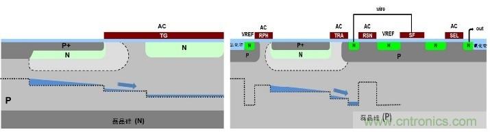 “嵌入式光電二極管” (pinned photodiode,PPD) 或“空穴堆積二極管”(hole accumulation diode,HAD) 最初開發(fā)目的是消除延遲并把全部電荷從光電二極管轉(zhuǎn)移到ITCCD寄存器[12]。CMOS圖像傳感器的一個重大發(fā)展是在2000年代初期引進ITCCD光電二極管結(jié)構(gòu)[11],如圖7所示。在CMOS中,像素結(jié)構(gòu)多數(shù)以每像素的晶體管數(shù)目來表示。大部分 CMOS圖像傳感器傾向使用電子卷簾快門(electronic rolling shutter),這有助于集成并只需少至三個晶體管 (3T)就能實現(xiàn)。雖然有結(jié)構(gòu)簡單的優(yōu)點,3T像素結(jié)構(gòu)的缺點是電路來自kT/C (或溫度) 噪聲的像素生成時域噪聲會較大,而且不能輕易消除。