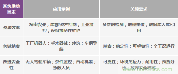 工業(yè)機(jī)械和流程最具價(jià)值的進(jìn)步集中在有形的系統(tǒng)級(jí)優(yōu)勢(shì)上,而這通常會(huì)帶來(lái)設(shè)計(jì)和實(shí)現(xiàn)方面的挑戰(zhàn),這些挑戰(zhàn)又會(huì)發(fā)展成新的問(wèn)題解決方案和業(yè)務(wù)模式。這種系統(tǒng)級(jí)推動(dòng)因素可以歸納為三項(xiàng)追求,即對(duì)資源效率、關(guān)鍵精度和更高安全性的追求。瞄準(zhǔn)這些橫跨多個(gè)行業(yè)的改進(jìn)的應(yīng)用,包括跨越空中/地面/海上、室內(nèi)/室外、短期/長(zhǎng)期和人/機(jī)等,但無(wú)論如何,它們都依賴(lài)于共同的屬性;即精度、可靠性、安全性和智能處理與分析,如表1所示。