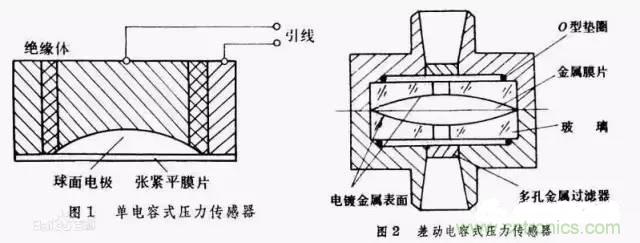 它一般采用圓形金屬薄膜或鍍金屬薄膜作為電容器的一個(gè)電極,當(dāng)薄膜感受壓力而變形時(shí),薄膜與固定電極之間形成的電容量發(fā)生變化,通過測(cè)量電路即可輸出與電壓成一定關(guān)系的電信號(hào)。電容式壓力傳感器屬于極距變化型電容式傳感器,可分為單電容式壓力傳感器和差動(dòng)電容式壓力傳感器。