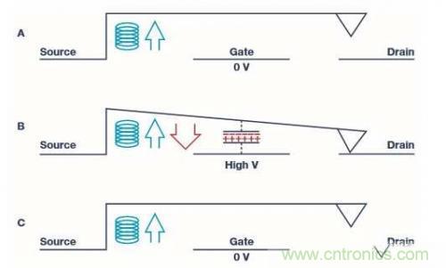請注意,即便是在開啟位置上,開關(guān)梁仍然會有將開關(guān)往上拉動的彈簧力(藍(lán)色箭頭),但是只要向下拉動的靜電力量比較大,那么開關(guān)就會維持在開啟的狀態(tài)。 最后,當(dāng)閘極電壓被移除時(shí)(圖一中的C狀況),也就是在閘極電極上0 V,靜電吸引力也會跟著消失,而開關(guān)梁會以具有足夠回復(fù)力(藍(lán)色箭頭)的彈簧而動作,開啟源極與汲極之間的鏈接,然后回返至原本的關(guān)閉位置。
