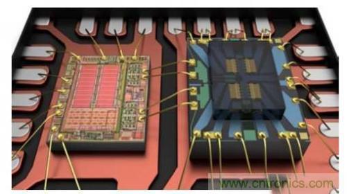 圖四 : 驅(qū)動IC(左側(cè)),MEMS開關(guān)芯片(右側(cè))被黏著和線焊至金屬導(dǎo)線架上