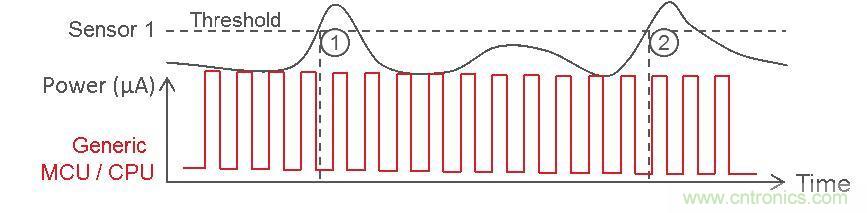 當外部事件超過傳感器閾值時才喚醒 CPU 并不是一個革命性的概念。本質(zhì)上,它會將恒定的 MCU 工作周期從圖 1 中移至單個事件;當模擬事件超過給定閾值時,MCU 蘇醒并執(zhí)行各種行動。
