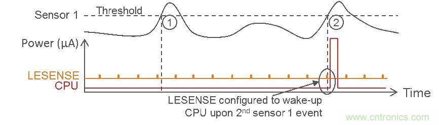 在以下概念圖中,LESENSE 被配置為允許傳感器 1 超過其可配置閾值兩次之后才喚醒 CPU。
