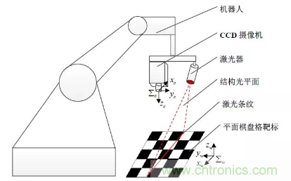 一個(gè)六自由度機(jī)器人,一個(gè)CCD 工業(yè)攝像機(jī),一個(gè)激光器和一個(gè)平面棋盤格靶標(biāo)。