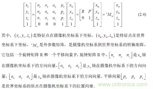其中:(u,v)是特征點(diǎn)的圖像坐標(biāo),(u0,v0) 光軸中心的圖像坐標(biāo),(kx ky )是X 軸,Y 軸方向的放大系數(shù),(xc yc zc) 是特征點(diǎn)在攝像機(jī)坐標(biāo)系下坐標(biāo), Mc 是攝像機(jī)內(nèi)參數(shù)矩陣。