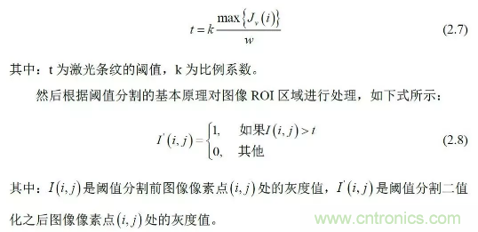 根據(jù)圖像中激光條紋的灰度值高于圖像中其它像素的灰度值以及激光條紋所在區(qū)域比較集中的特點(diǎn),利用圖像ROI 內(nèi)行像素灰度值之和計(jì)算激光條紋的自適應(yīng)閾值: