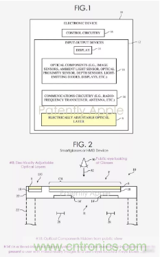 蘋果公司希望通過此專利推進其在可調節(jié)光學層上的技術發(fā)展。此發(fā)明支持使用者對智能眼鏡的光學層進行模式調節(jié),例如按照個人喜好調整光學層的明暗。下圖1是具有光學組件和電可調光學層的電子設備示意圖;下圖2是頭戴式設備采用電可調光學層(#8)的示意圖。