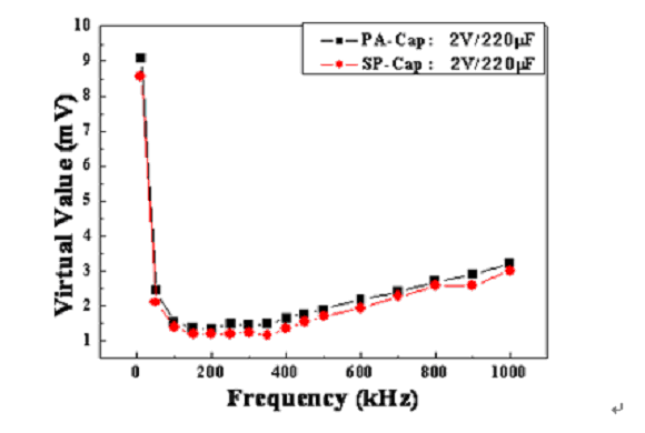 如上面的濾波效果顯示,當開關電源頻率在300KHz左右時,同種規(guī)格的PA-Cap的輸出均方根與SP-Cap的很接近,所以PA-Cap濾波效果基本接近于SP-Cap。由于具有低的ESR、允許的紋波電流大,所以PA-Cap也是DC/DC轉換器或開關電源輸出電容的優(yōu)選電容之一。