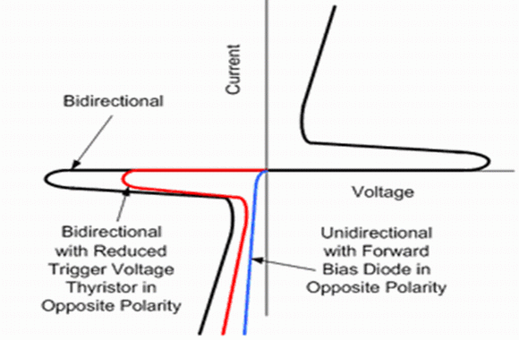 大多數(shù)晶閘管浪涌保護(hù)器件(TSPD)是對(duì)稱的雙向特性的,但也有內(nèi)含二極管單向特性的,如圖7所示。而不對(duì)稱的雙向晶閘管浪涌保護(hù)器件(TSPD)是在一個(gè)極性方向有著減小了的觸發(fā)電壓,如圖7所示。