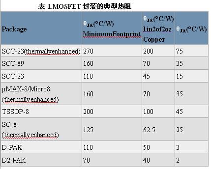 注:同樣封裝類型的不同器件,以及不同制造商出品的相似封裝的熱阻各不相同,和封裝的機(jī)械特性、管芯尺寸和安裝及綁定方法有關(guān)。需仔細(xì)考慮MOSFET數(shù)據(jù)資料中的熱信息。