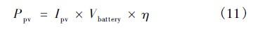 式(8)(9)中I為負(fù)載所需電流,T為負(fù)載每日工作小時(shí)數(shù)。Ta為平均日照時(shí)間。t為連續(xù)雨天數(shù),Ksafe為安全系數(shù),Ksoc為蓄電池容許放電深度,η為變換器效率。按三段式10小時(shí)充電法,在恒流充電階段,充電電流icharge為0.1Cbattery。則恒流充電階段,充電功率為: