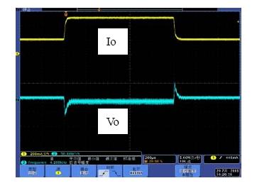 系統(tǒng)的帶寬是影響系統(tǒng)動態(tài)響應(yīng)的重要因素,相位裕度是影響系統(tǒng)穩(wěn)定性的重要因素。如果選擇不同的Rf1,系統(tǒng)的帶寬和相位裕度會產(chǎn)生變化,也就是動態(tài)響應(yīng)和穩(wěn)定性會發(fā)生變化。具體以表1來分析,當Rf1從300k變到750k,系統(tǒng)地帶寬從51.1kHz變到26.1kHz,因此系統(tǒng)的動態(tài)響應(yīng)會相應(yīng)的變差,而由于相位裕度都是足夠的,因此系統(tǒng)都處于穩(wěn)定工作的狀態(tài)。圖7和圖8是做負載切換的動態(tài)響應(yīng)測試結(jié)果,從測試結(jié)果可以看出環(huán)路響應(yīng)速度變慢,導致輸出電壓過沖變大,動態(tài)響應(yīng)效果變差。