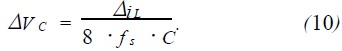 計(jì)算第二部分,對于一般電容,都具有串聯(lián)等效電感和串聯(lián)等效電阻(其實(shí)還有并聯(lián)等效絕緣電阻)。串聯(lián)等效電感只在較高頻率時(shí)起作用,在分析開關(guān)頻率時(shí)可以將其忽略,但必須考慮的是串聯(lián)等效電阻ESR.電流ΔiC流過ESR時(shí),會(huì)在ESR兩端產(chǎn)生電壓降,其值為: