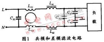開關(guān)電源的開關(guān)頻率及其諧波的主要表現(xiàn)是電源線上的干擾,稱之為傳導(dǎo)干擾。傳導(dǎo)干擾分為共模干擾和差模干擾。共模干擾是由載流導(dǎo)體與大地之間的電位差產(chǎn)生的,其特點(diǎn)是兩條線上的干擾信號(hào)電壓是同電位同相的;而差模干擾則是由載流導(dǎo)體之間的電位差產(chǎn)生的,其特點(diǎn)是兩條線上的干擾信號(hào)電位相同,但相位相反。事實(shí)上,針對(duì)不同的干擾信號(hào),EMI濾波電路也分為抗共模干擾濾波電路和抗差模干擾濾波電路,圖1所示是其濾波電路。