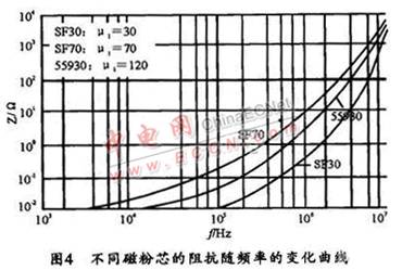 共模電感線圈如圖l中Lcl,Lc2是繞在一只磁芯上的兩組獨(dú)立的線圈,所繞圈數(shù)相同,繞向相反。這樣,當(dāng)EMI濾波器接入電路后,兩組線圈產(chǎn)生的磁通在磁芯中將相互抵消,故不會(huì)使磁芯飽和。對(duì)于干擾信號(hào)而言,共模磁芯一般工作在低磁場區(qū)域,所以,共模濾波電感選用的磁性材料要求具有較高的初始磁導(dǎo)率μi。如果只針對(duì)濾波器的插入損耗這一指標(biāo),則初始磁導(dǎo)率μi越高,濾波電路呈現(xiàn)的感抗就越大,所得到的插入損耗指標(biāo)就越好。但在整個(gè)電路中,還要綜合考慮磁性材料在電路中的其它特性,如頻率阻抗特性、居里溫度、磁材的形狀等等。μi值不同的各種磁性材料,在不同頻率下的阻抗特性也不一樣,故要根據(jù)所需要的頻率范圍來選取合適μi值的磁性材料。圖3所示是不同類型的高μi軟磁材料在同樣條件下的頻率與阻抗關(guān)系曲線,該曲線反映出電感磁芯的插入損耗變化趨勢。其它的性能參數(shù)(如電感值、體電阻等)如表1所列。