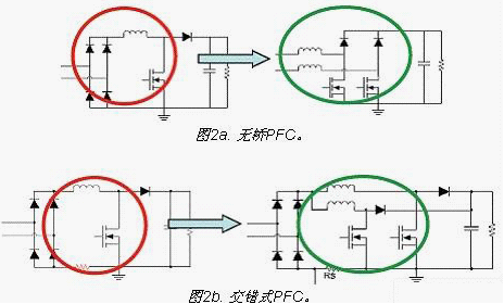 改善PFC能效的目標(biāo)是為了實現(xiàn)功率因數(shù)校正短的效率達(dá)到96%以上。采用無橋PFC(圖2a)可以減少橋損耗,采用交錯式PFC(圖2b)可以滿足較高功率應(yīng)用的要求,以提升PFC能效。此外,還可以利用IC技術(shù)減少開關(guān)損耗,并利用更優(yōu)化的拓?fù)浣Y(jié)構(gòu)來減少EMI濾波器損耗。