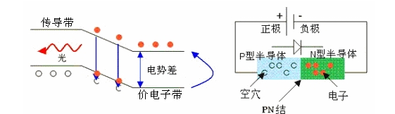 LED是電子二極管的一種,主要構(gòu)造是PN結(jié)。如圖1,當向LED的兩端施加電壓,電子就會吸收能量并向價電子帶轉(zhuǎn)移,然后再將吸收的能量釋放出來。這個被釋放出的能量就是光。放出的光的波長和顏色是由半導(dǎo)體的電勢差決定的。