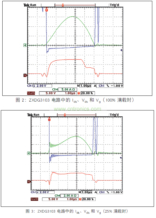 在滿載測試電路中,柵極驅(qū)動(dòng)電壓在正弦電流開始減少時(shí)早期終止,這可能是由電路的電感和 Q1 TO-220 封裝的電感造成的。 與前面使用 ZXGD3103 的測試一樣,對布局進(jìn)行改進(jìn)、減少阻抗和選擇低電感的封裝應(yīng)該可以解決此問題。