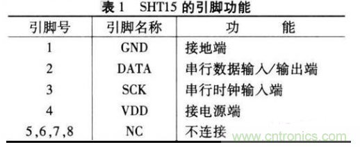 SHT15的引腳比較少.使用方便。其引腳排列如圖2所示。引腳功能如表1所示。SHT15型智能傳感器的相對(duì)濕度測(cè)量范圍是0~100%。分辨率達(dá)0.03%,最高精度為+2%RH,溫度測(cè)量范圍是—40℃一十123.8℃.分辨率為0.1℃.電源電壓范圍是+2.5V一+5.5V.響應(yīng)時(shí)間小于3s。