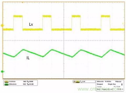 在高壓側(cè)開(kāi)關(guān)接通的周期中(圖5中綠色箭頭指示電流),電感器電流斜坡上升,將能量?jī)?chǔ)存在電感器中,輸出電容器向負(fù)載提供電流。在低壓側(cè)開(kāi)關(guān)接通的周期中(圖5中紅色箭頭指示電流),電感器電流斜坡下降,向負(fù)載提供電流,并為輸出電容器充電。ISL85415EVAL2Z反相降壓-升壓電路板的工作波形如圖6所示。