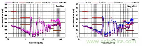 圖3顯示了增加一個(gè)DM濾波器后的EMI結(jié)果。 從圖中可以看出,DM濾波器衰減了中頻段DM噪聲(2MHz至30MHz)近35dBμV/ m。此外高頻段噪聲(30MHz至100MHz)也有所降低,但仍超過限制水平。這主要是因?yàn)镈M濾波器對(duì)于高頻段CM噪聲的濾除能力有限。