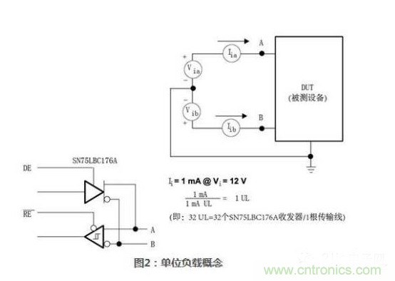 2.1.2單位負(fù)載概念掛接在同一485通訊總線上的驅(qū)動(dòng)器和接收器,其最大數(shù)量取決于它們的負(fù)載特性。驅(qū)動(dòng)器和接收器的負(fù)載都是相對(duì)單位負(fù)載而衡量的。485標(biāo)準(zhǔn)規(guī)定一根傳輸總線上最多可以掛接32個(gè)單位負(fù)載。單位負(fù)載定義為:在12V共模電壓環(huán)境中,允許通過(guò)穩(wěn)態(tài)負(fù)載1mA電流,或者是在-7V共模電壓環(huán)境中,允許通過(guò)穩(wěn)態(tài)負(fù)載0.8mA電流。單位負(fù)載可能由驅(qū)動(dòng)器、接收器和失效保護(hù)電阻組成,但不包括AC終端匹配電阻。