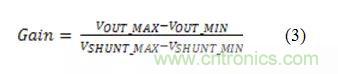 計(jì)算放大器的增益。運(yùn)算放大器放大VSHUNT以產(chǎn)生VOUT_MIN到VOUT_MAX的輸出電壓擺幅,其中VOUT_MIN和VOUT_MAX分別是放大器的最小和最大輸出擺幅極限。公式3用于計(jì)算放大器產(chǎn)生所需的輸出擺幅的增益: