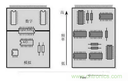 上面的兩種情況,說明數(shù)模混合單板中,模擬電路極易受到干擾,會影響信噪比等指標。所以在數(shù)模混合單板 PCB 設(shè)計過程中,要對布局布線提出很高的要求。
