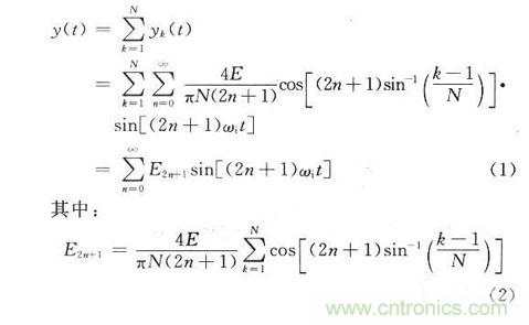 首先對(duì)量化過(guò)程進(jìn)行分析,現(xiàn)假設(shè)基帶輸入信號(hào)為一個(gè)正弦信號(hào)gi(t)=Esinωit,量化位數(shù)為N,經(jīng)過(guò)量化后的信號(hào)可用階梯波y(t)表示,y(t)可以被認(rèn)為是N對(duì)矩形波的疊加。如果A/D變換的量化位數(shù)為m,那么正或負(fù)半周的量化臺(tái)階數(shù)為N=2m-1。階梯波的表達(dá)式為: