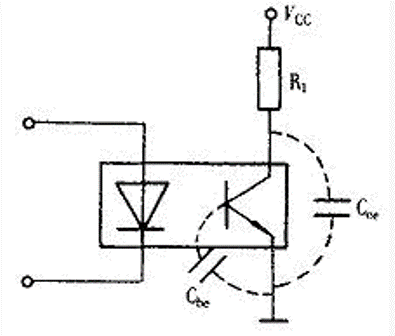 由于光耦自身存在的分布電容,對(duì)傳輸速度造成影響,光敏三極管內(nèi)部存在著分布電容Cbe和Cce,如圖4所示。由于光耦的電流傳輸比較低,其集電極負(fù)載電阻不能太小,否則輸出電壓的擺幅就受到了限制。但是,負(fù)載電阻又不宜過大,負(fù)載電阻RL越大,由于分布電容的存在,光電耦合器的頻率特性就越差,傳輸延時(shí)也越長。