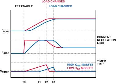 這個公式假定負(fù)載電流瞬時從0 A上升到30 A,這是一個理想情況。實(shí)際上,較大MOSFET的柵極電荷量QGS會限制柵極電壓的壓擺率,從而限制上電電流,因此,一定量的電荷會傳輸?shù)截?fù)載電容而不觸發(fā)定時器功能。在圖4中,具有較大QGS的MOSFET會導(dǎo)致定時器的工作時間短于具有較小QGS的MOSFET,前者為T1 ~ T3,而后者為T0 ~ T2。[page]