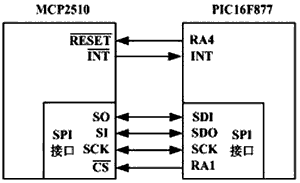其中,SCK為SPI總線時鐘,PIC16F87x模塊的SPI接口接MCP2510的SI、SO、SCK,RA4與RA1分別控制MCP2510的芯片復(fù)位和片選。INT接受MCP2510的中斷請求。
