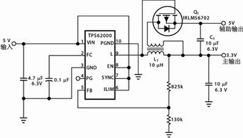 圖2是一種設(shè)計頗為緊湊的雙電壓輸出電路,工作頻率750kHz,變換效率可達95%。其中,3.3V主電源由降壓型單片同步開關(guān)電源TPS62000構(gòu)成;該器件具有軟啟動功能,能夠有效抑制輸入浪涌電流與輸出電壓過沖,最大輸出電流600mA。TPS62000的輸出端“L”為低電平時,外接P溝道場效應(yīng)管Q1隨之導(dǎo)通而令儲能電感L1副繞組的感應(yīng)電壓向輸出電容C1充電,C1之端電壓同3.3V主輸出疊加即為輔助輸出電壓,其數(shù)值取決于L1主、副繞組的匝數(shù)比;輔助輸出若為5V,匝數(shù)比可取2:1。