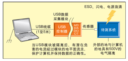 圖2:未隔離的USB數(shù)據(jù)采集模塊在ESD、閃電、電源浪涌的時候可能損害系統(tǒng)并導(dǎo)致數(shù)據(jù)不正確。