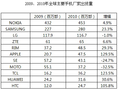- 2010年全球手機(jī)出貨量增幅高達(dá)20.8%