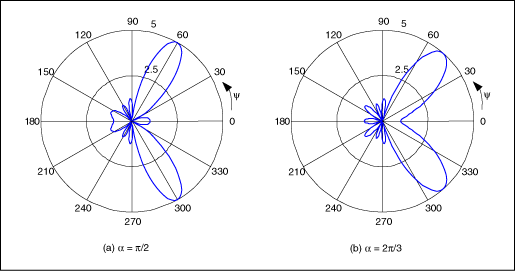 除了改變波瓣的寬度,通過對連續(xù)單個天線的信號設定固定的相位延遲α(圖3),還可以實現(xiàn)主波瓣在x–y平面內的旋轉。天線陣列的輻射圖正比于天線陣列系數(shù)F(u):